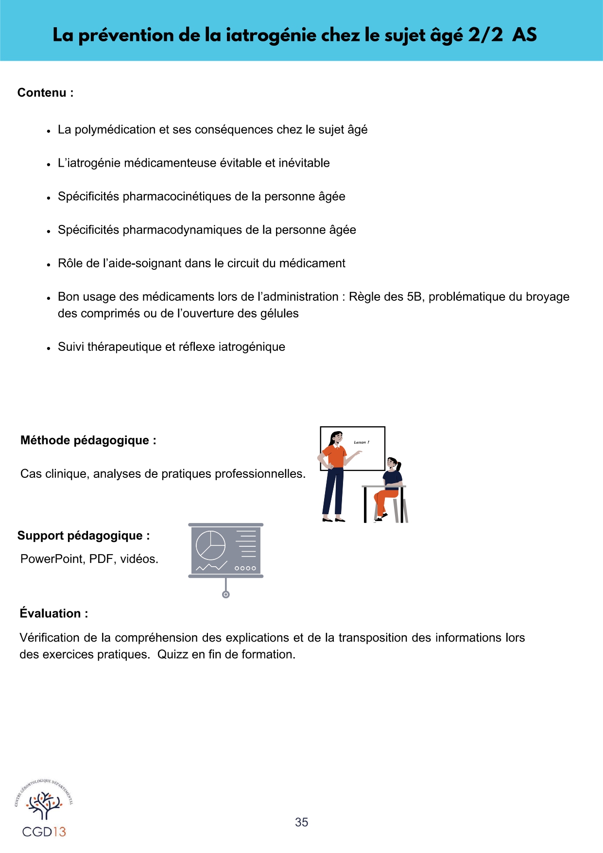 Cette formation permet de prévenir la iatrogénie chez le sujet âgée. Cette formation est destinée aux Aides-Soignant(e)s. Une version de cette formation est également disponible pour les Infirmier(e)s Diplômé(e)s d'Etat.